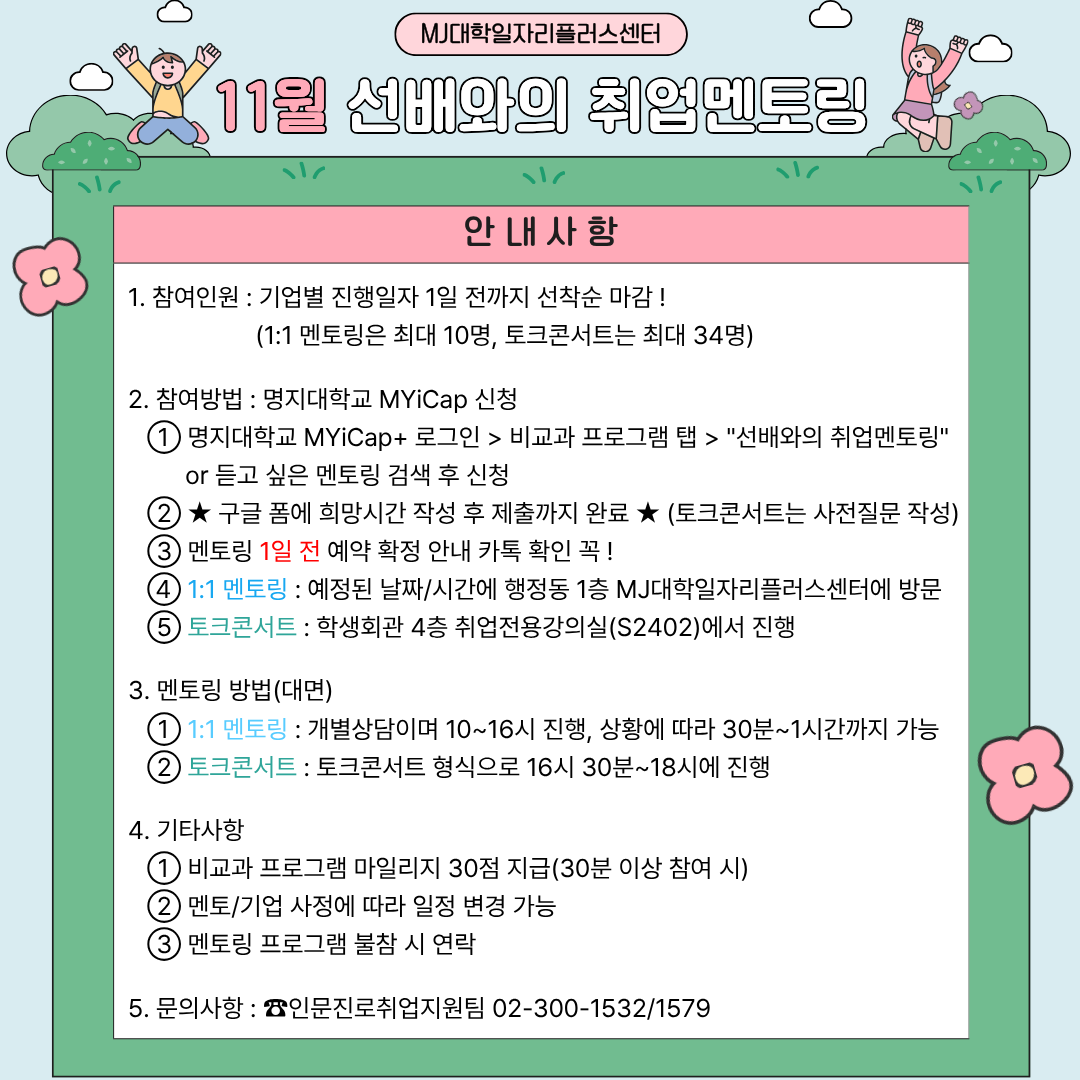 다. 추가로 진행되는 멘토링 일정은 홈페이지에 지속적으로 공지하고,MJ대학일자리플러스센터 인스타그램 및 카카오톡 채널을 통해 추가 홍보 예정