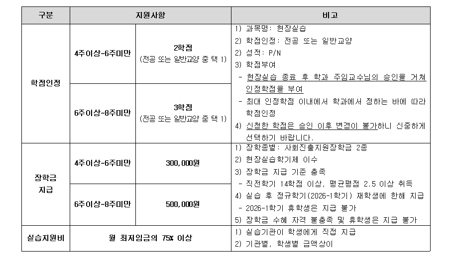 나. 현장실습 중도 포기자 및 부적격자는 현장실습 미인정(학점 및 장학금 미지급)
