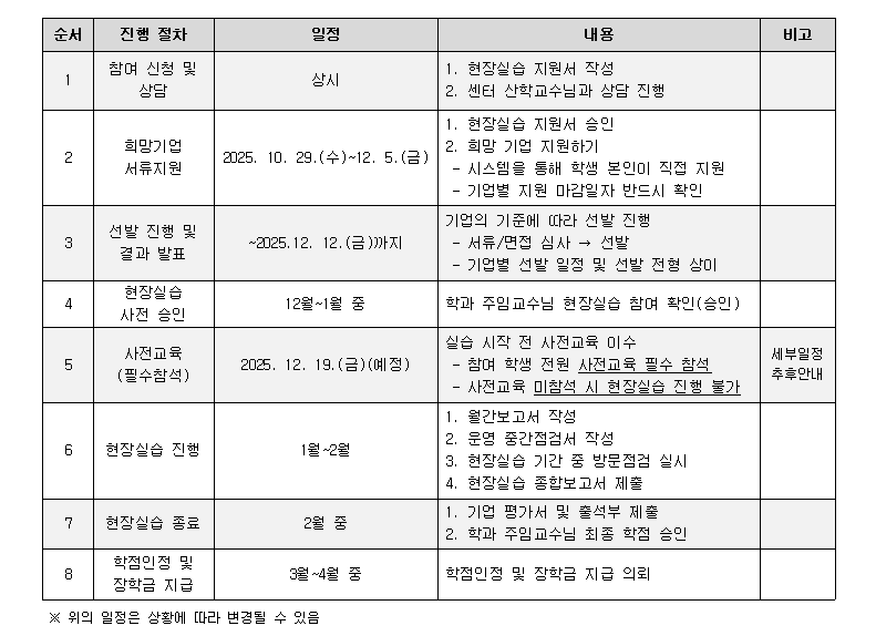 2025학년도 동계(1월~2월) 현장실습학기제 참여학생 모집 안내