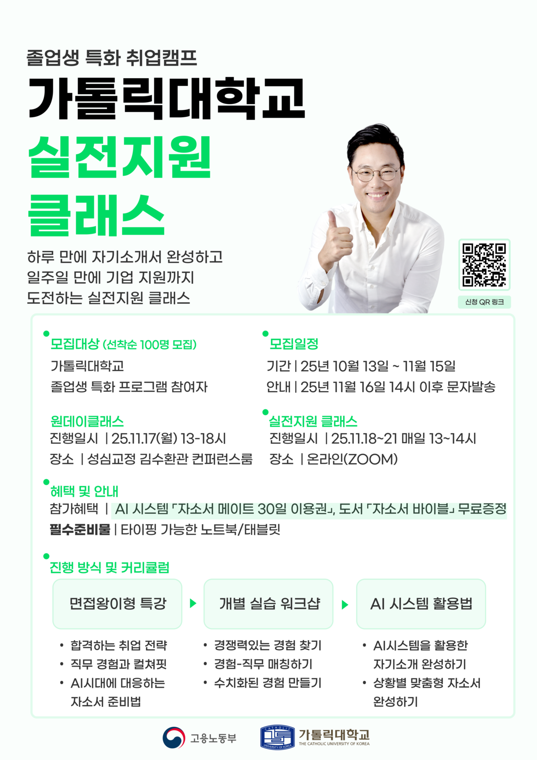 가톨릭대학 졸업생 특화 프로그램 사업의 일환으로 실시하는 2025학년도 집중 취업캠프 프로그램을 아래와 같이 시행하오니 관심 있는 학생들의 많은 신청 바랍니다.