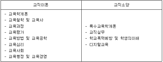 가. 교직이론 과목은 이수코드가 '교직'으로 지정된 교과목으로 교직과목(2학점) 중 '교직이론' 및 '교양소양' 부분에 포함되는 강의를 2과목 이상 이수해야함.
